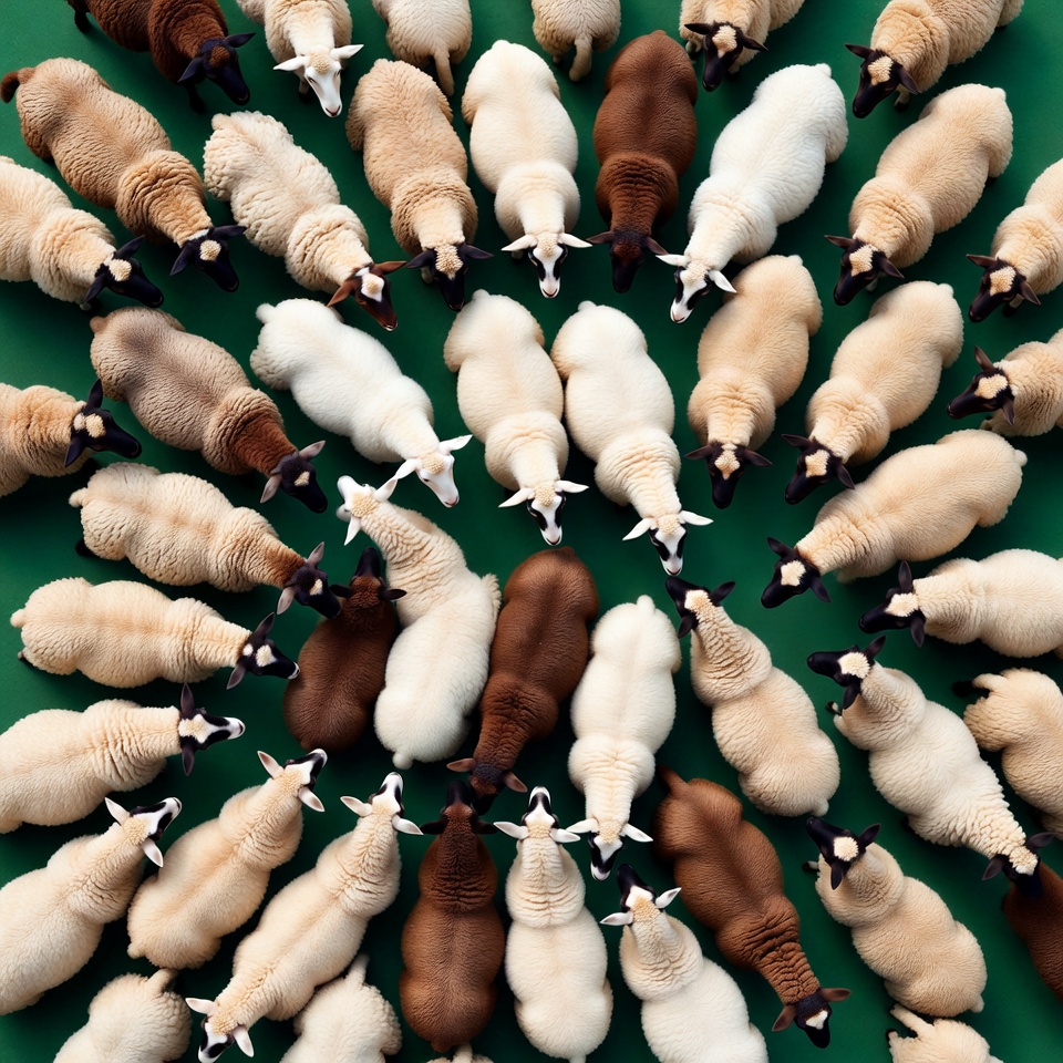 animal pattern, beige sheep, brown sheep, circle, circular arrangement, farm animals, green background, isolated background, livestock, radial sheep, sheep herd, top view, white sheep, woolly sheep, sheep