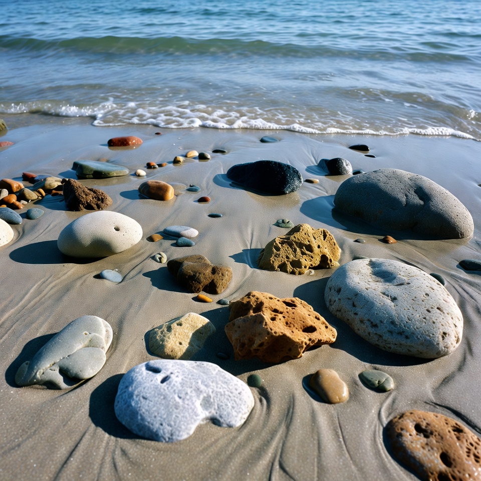A variety of colorful rocks and pebbles are scattered across wet sand near the ocean waves. The stones include smooth white, gray, brown, and textured orange pieces in different sizes. Gentle waves lap at the shore in the background under a clear sky.
