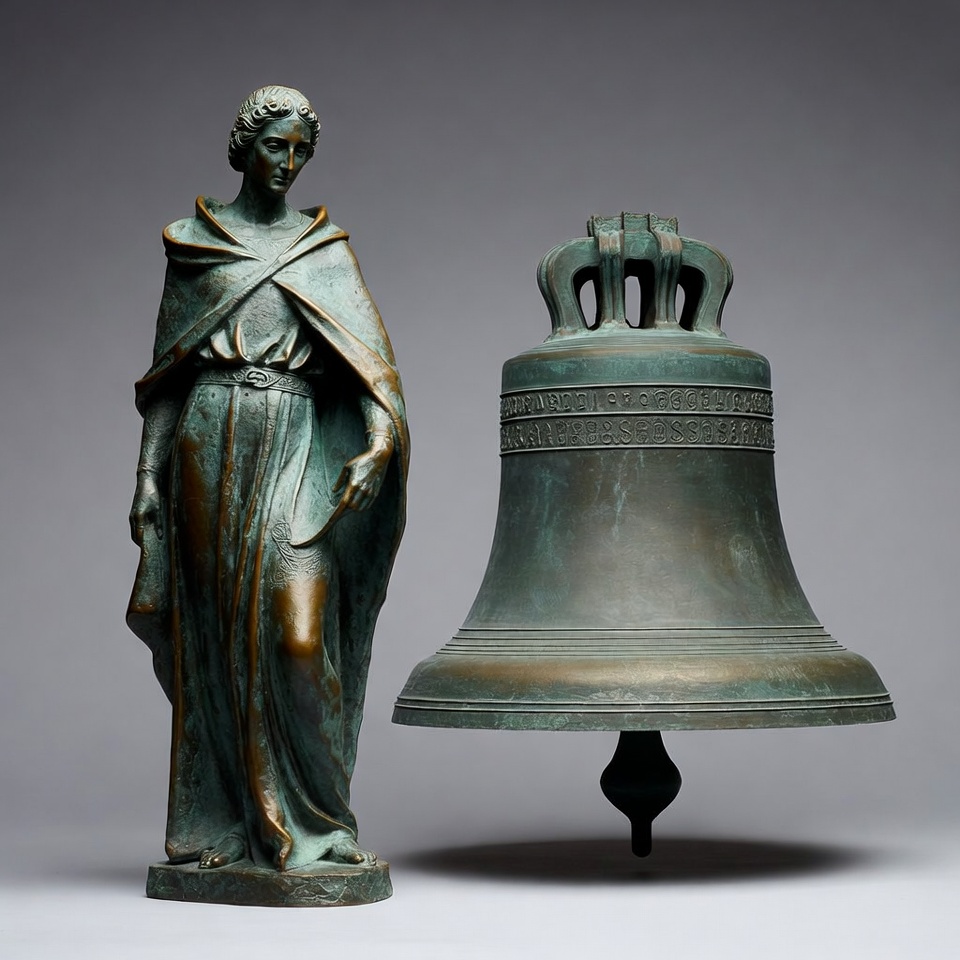 ancient figure, bell, bronze bell, classical woman, curly hair, draped clothing, female statue, flowing robes, freedom bell, greek statue, green patina, historical statue, isolated background, liberty bell, metallic sculpture, patina, roman statue, sculpture, woman statue, bronze statue