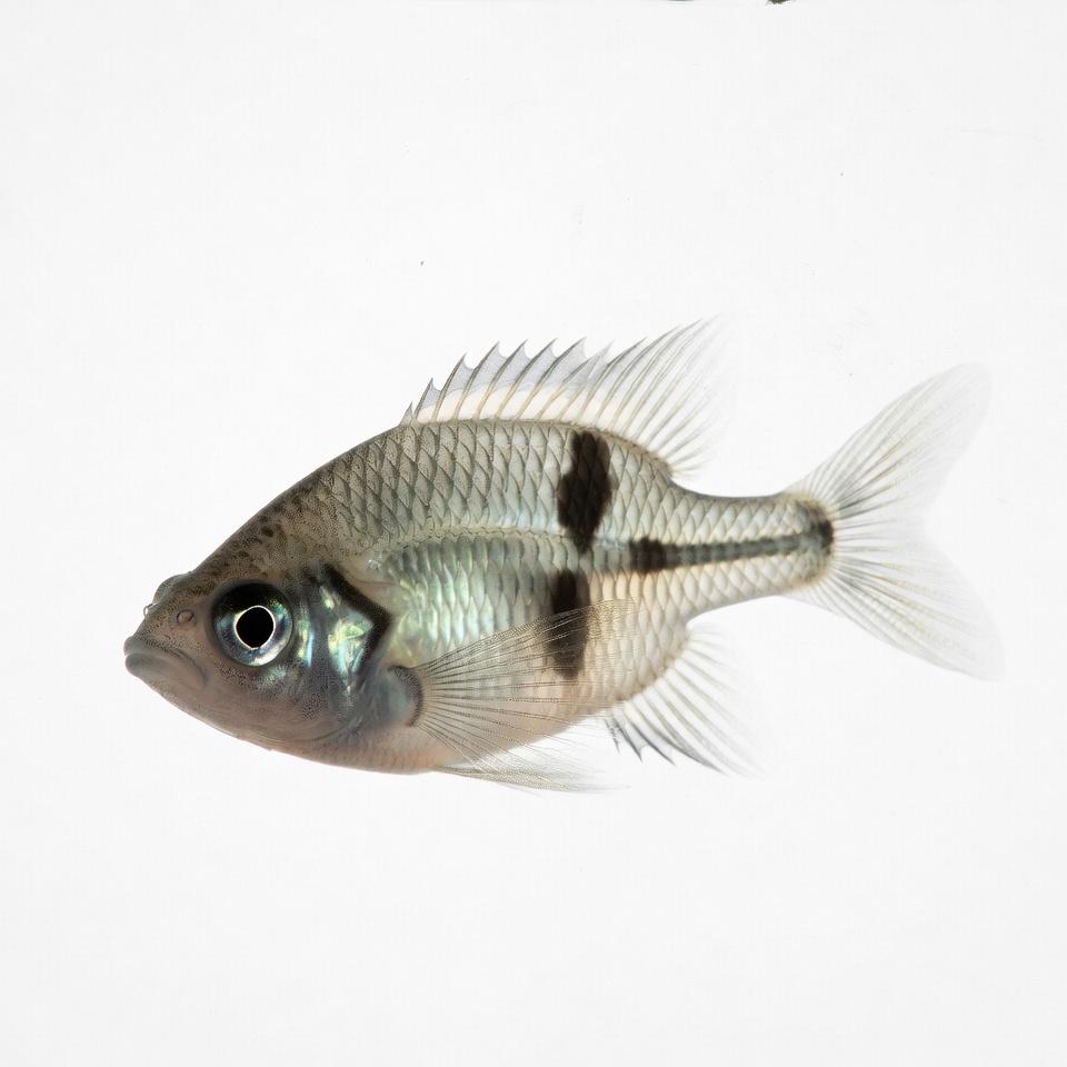 aquarium fish, black cross, cichlid fish, fish, freshwater fish, gray fish, isolated background, side view, striped fish, tropical fish, white background, convict cichlid