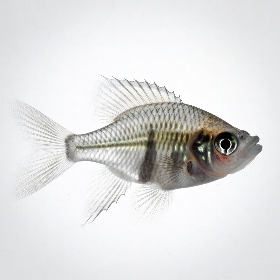 A small silver molly fish with translucent body and orange markings swims against a plain white background. It features large eyes, delicate fins, and a slightly open mouth. The fish displays intricate scale patterns and a streamlined shape.