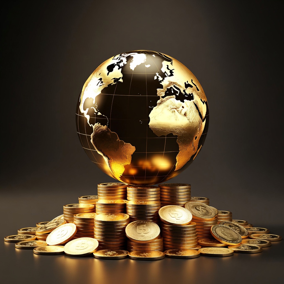 A shiny golden globe sits atop a tall stack of gold coins. The earth model features detailed black continents on a metallic gold surface. The image is rendered in a 3D style against a dark gradient background.