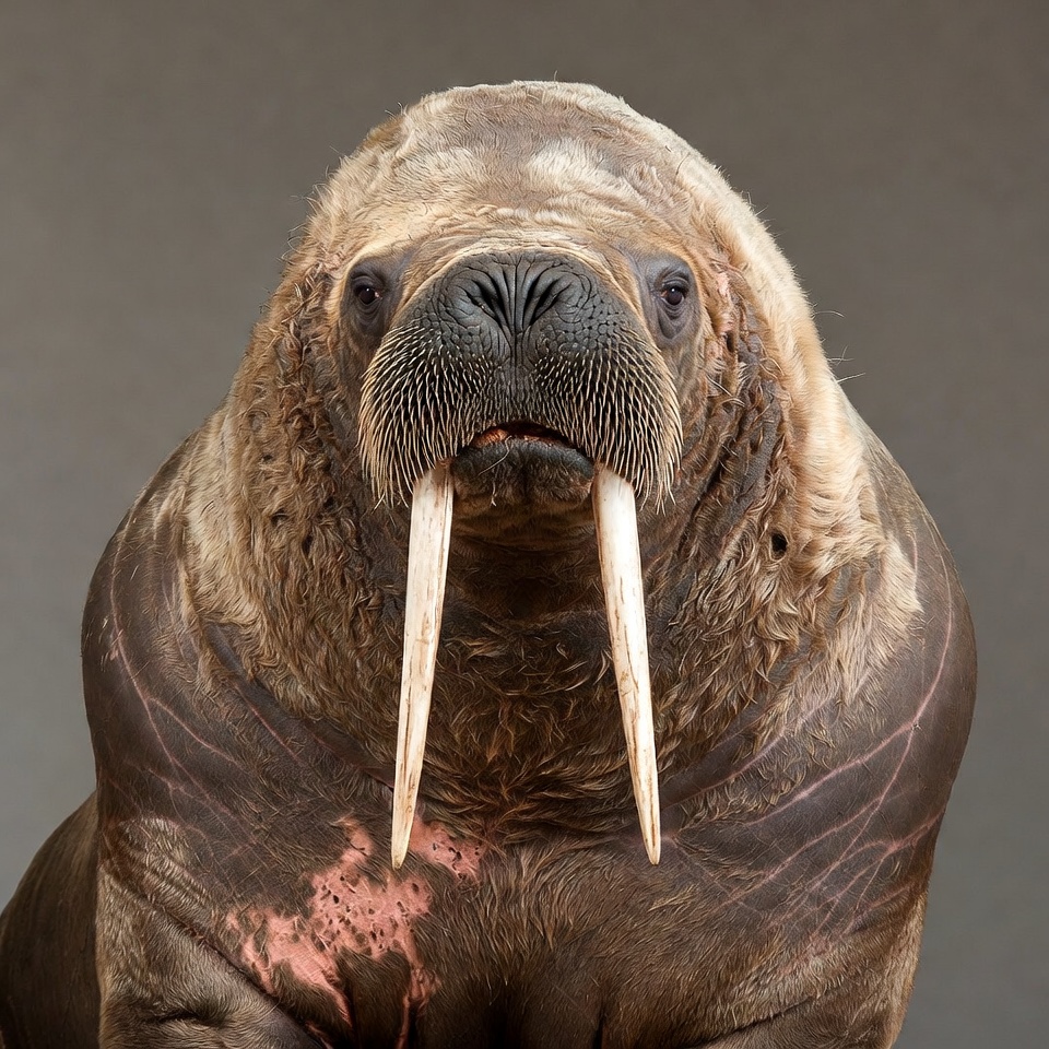 Arctic animal, animal, brown fur, close-up, fur, gray background, isolated background, long tusks, marine mammal, nose, pinniped, portrait, sea mammal, tusks, whiskers, white tusks, wildlife, zoo animal, walrus