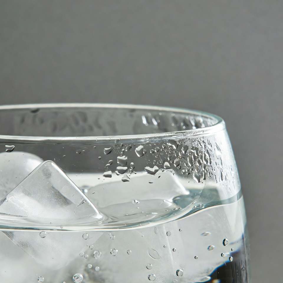 beverage, bubbles, clear glass, cold drink, condensation, droplets, fizzing water, gray background, ice cubes, ice water, refreshment, sparkling water, transparent glass, water glass