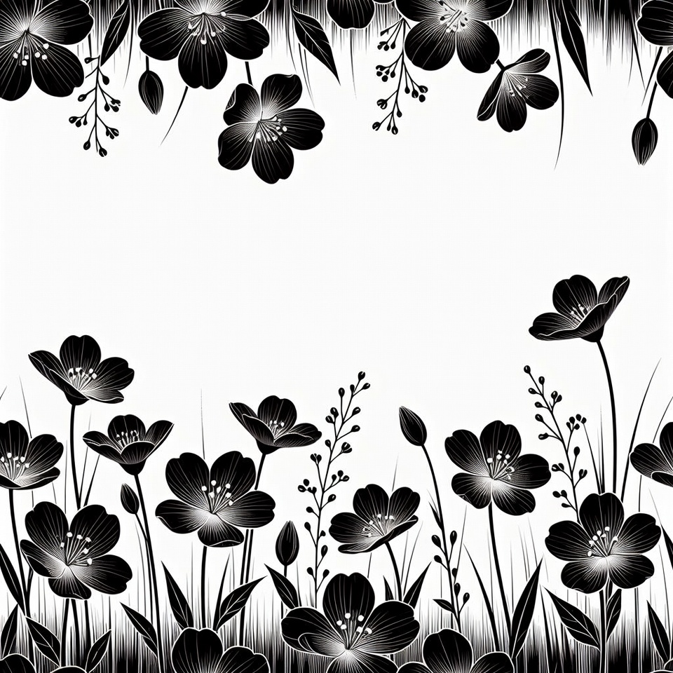 black outline, botanical illustration, clipart, decorative border, elegant flowers, floral design, floral pattern, flower arrangement, flower border, hibiscus flowers, illustration, isolated background, leaves, petals, silhouette flowers, stems, tropical flowers, vector art, white background, black flowers