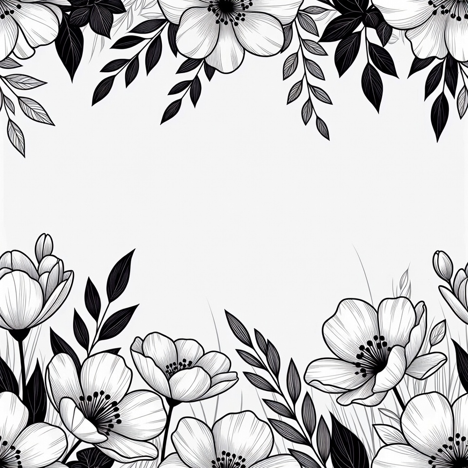 A delicate black and white illustration features clusters of open flowers with detailed petals and leaves forming a symmetrical border. The design frames a large central white space, ideal for text or graphics. Fine line art style emphasizes elegant stems and buds along the edges.