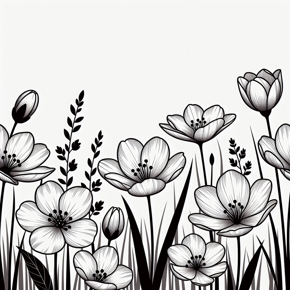 black and white, botanical, buds, clipart, floral border, flowers, grass, illustration, ink drawing, isolated background, leaves, line art, petals, seamless pattern, stems, vector art, anemone flowers