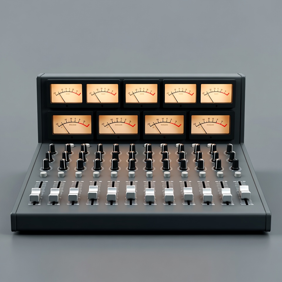 3D render, VU meters, analog mixer, audio engineering, audio equipment, broadcast mixer, control panel, faders, gray background, isolated, knobs, mixing console, music production, professional mixer, recording studio, sound mixer, soundboard, studio gear, switches, audio mixer