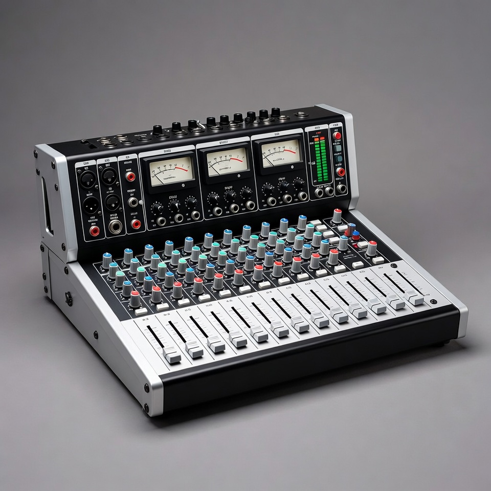 VU meters, black mixer, channels, faders, inputs, isolated background, knobs, live sound, mixing console, music equipment, professional audio, recording gear, silver mixer, sound mixer, studio mixer, audio mixer