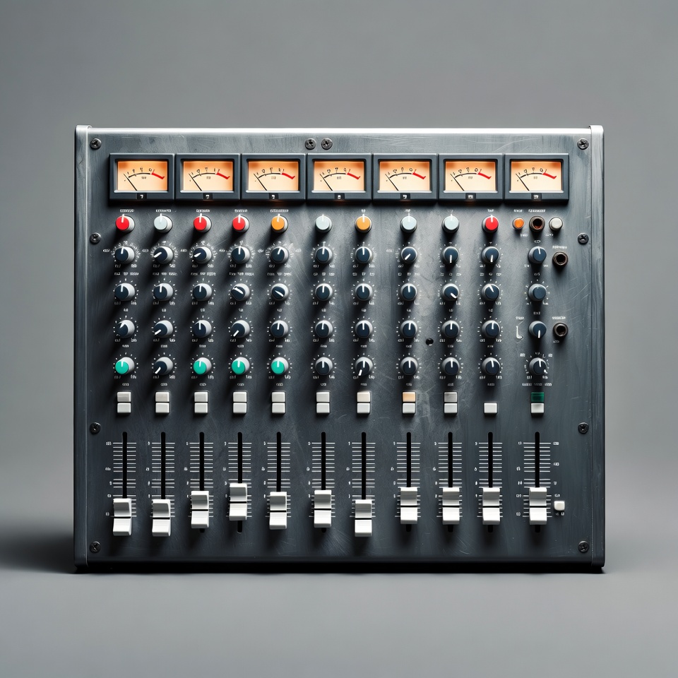 VU meters, analog mixer, audio gear, audio mixer, channel strips, control panel, dials, electronics, faders, gray background, isolated, knobs, mixing desk, music equipment, professional audio, recording studio, sliders, sound mixer, soundboard, studio equipment, vintage mixer, mixing console