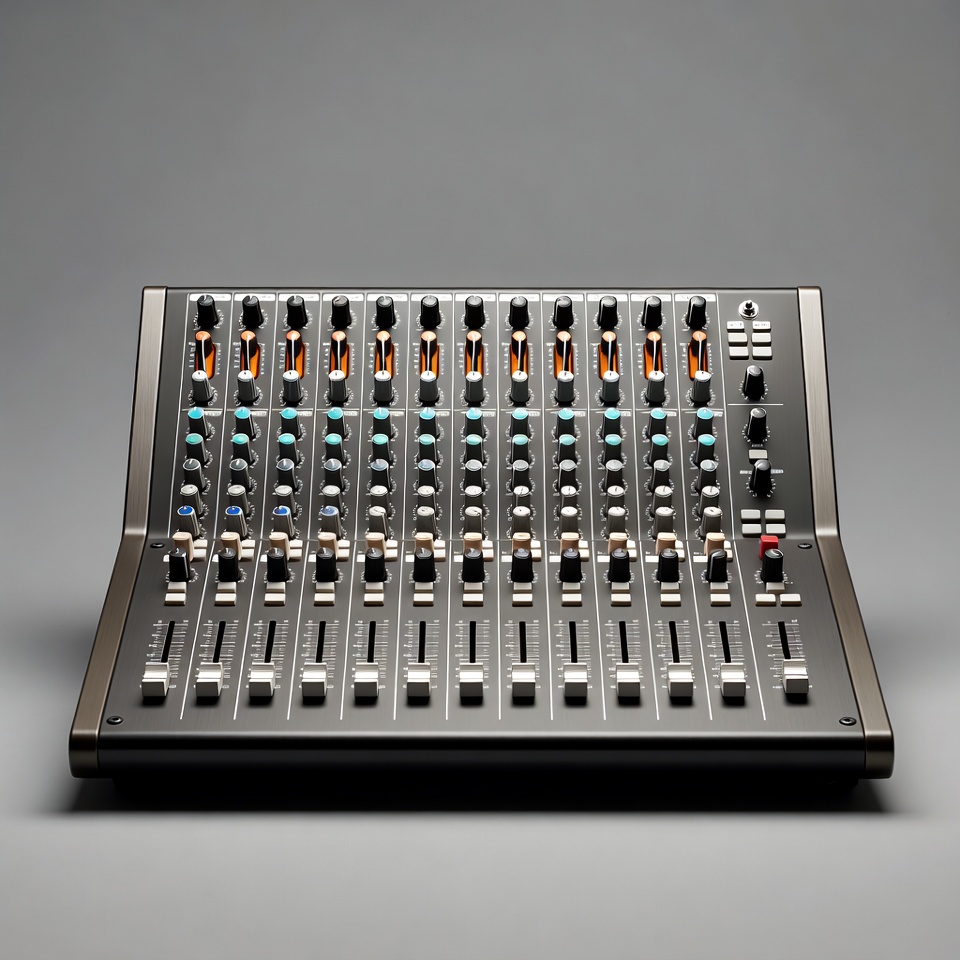 DJ mixer, analog mixer, audio mixer, broadcast equipment, channels, console closeup, faders, gray background, illuminated buttons, input channels, knobs, live sound, metallic design, music production, professional audio, recording mixer, silver mixer, sound mixer, studio equipment, mixing console