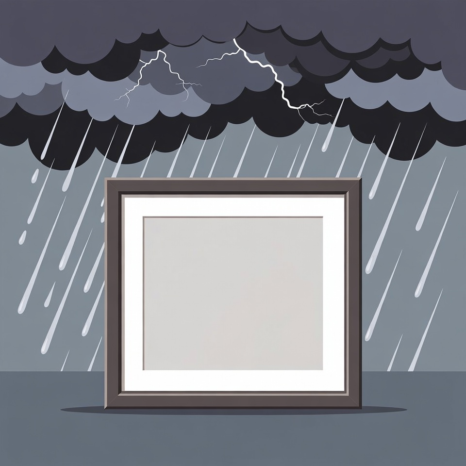 A simple illustration shows a blank white picture frame standing on a surface. Dark storm clouds with lightning and heavy rain surround the frame. The scene uses a cartoon style with a gray color palette.