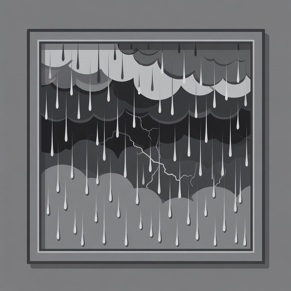 A grayscale illustration depicts layered storm clouds pouring heavy rain and flashing lightning bolts. The scene is framed within a square border on an isolated background. Multiple cloud layers create depth with varying shades of gray.