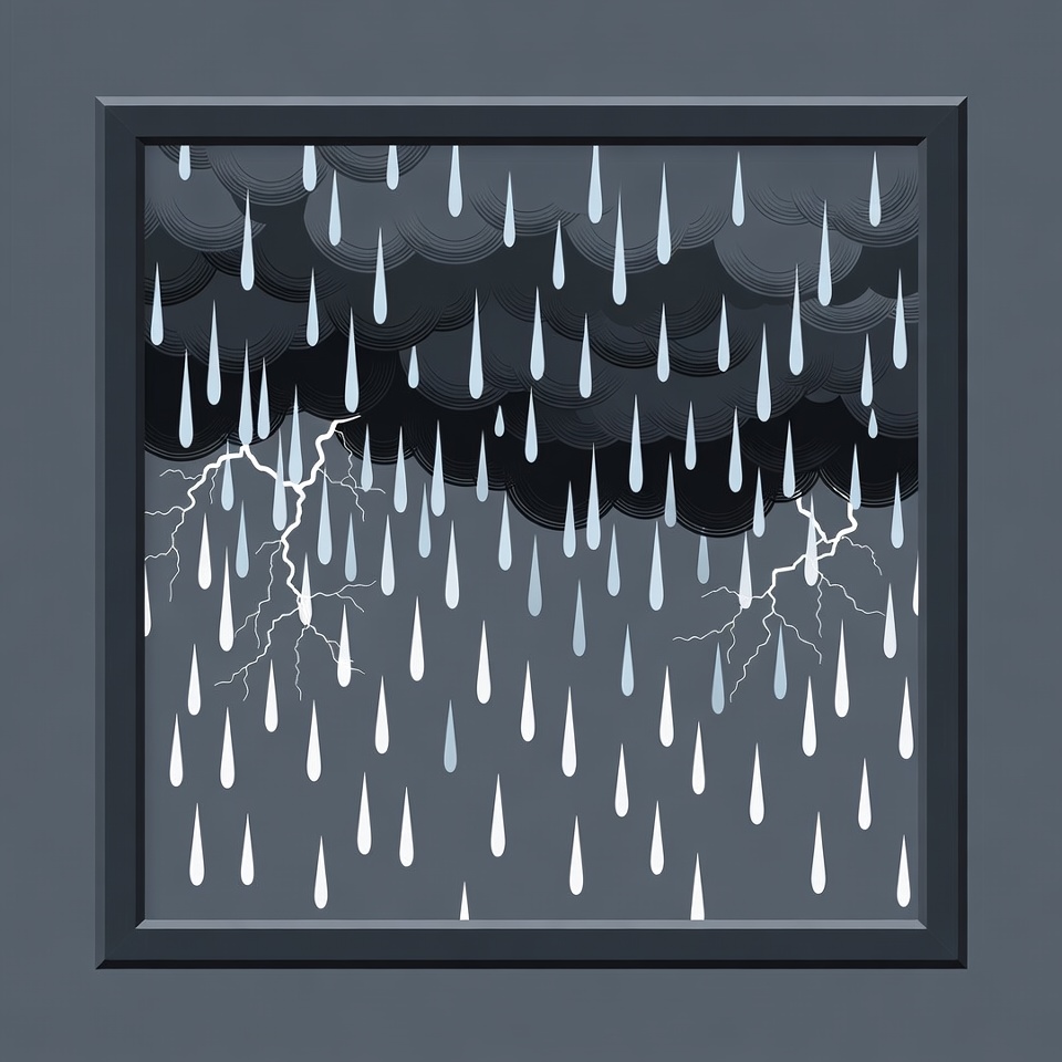 A digital illustration depicts a heavy rainstorm with dark clouds and multiple lightning bolts striking downward. White and gray raindrops pour densely from the stormy sky. The scene is framed by a dark border on a gray background.