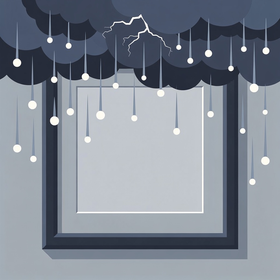 A digital illustration features dark, fluffy clouds with lightning bolts at the top. Heavy rain falls from the clouds into an empty gray picture frame below. White raindrops are visible against the stormy blue-gray background.