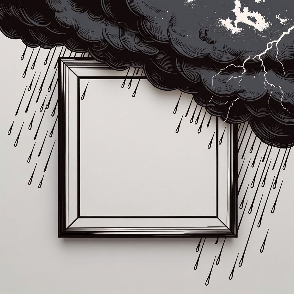 A black line art illustration depicts a white empty picture frame centered on a light background. Dark swirling storm clouds with lightning bolts and heavy rain pour down from the top, overlapping the frame. The dramatic weather elements frame the blank space inside.