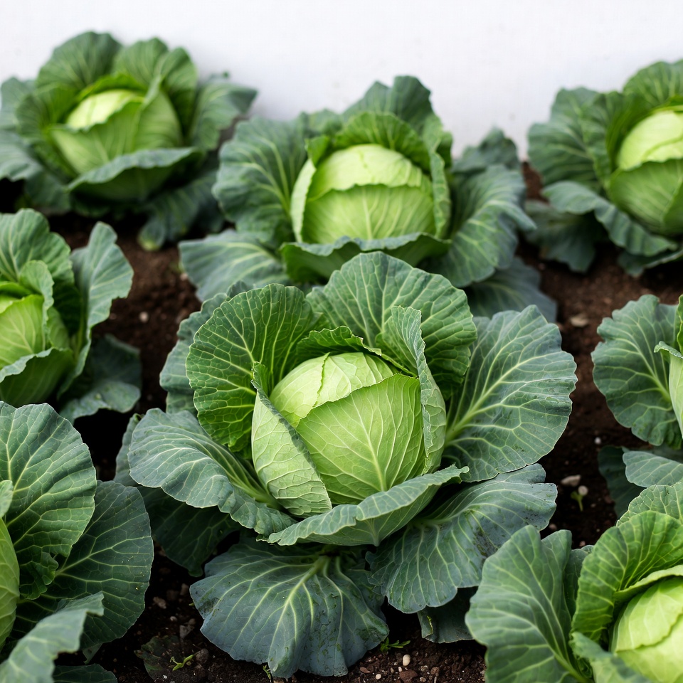Multiple fresh green cabbage heads grow in neat rows on dark soil. The cabbages have tightly packed leaves and vibrant green color. They are arranged closely together against a simple white background.