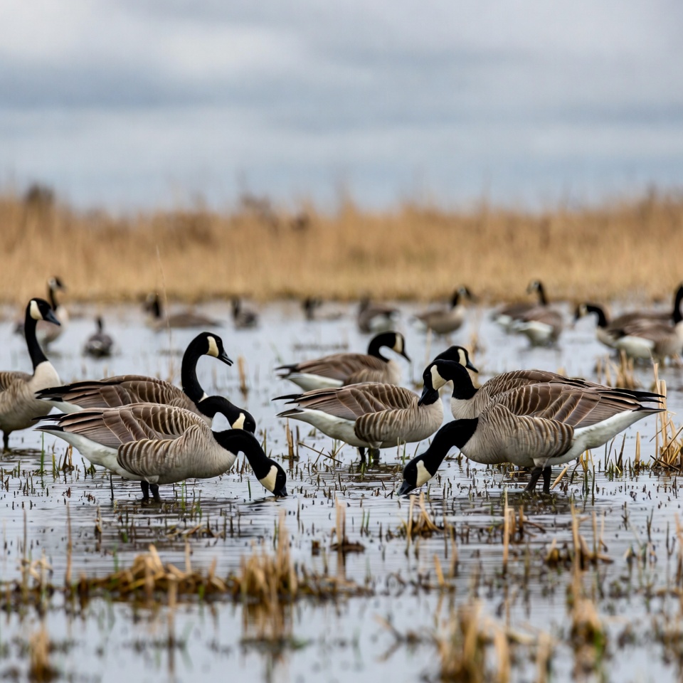 autumn marsh, bird flock, birds, brown grass, cloudy sky, feeding, flock, foraging, geese, group, marsh, nature, outdoor, reeds, shallow water, water, waterfowl, wild geese, wildlife, Canada geese