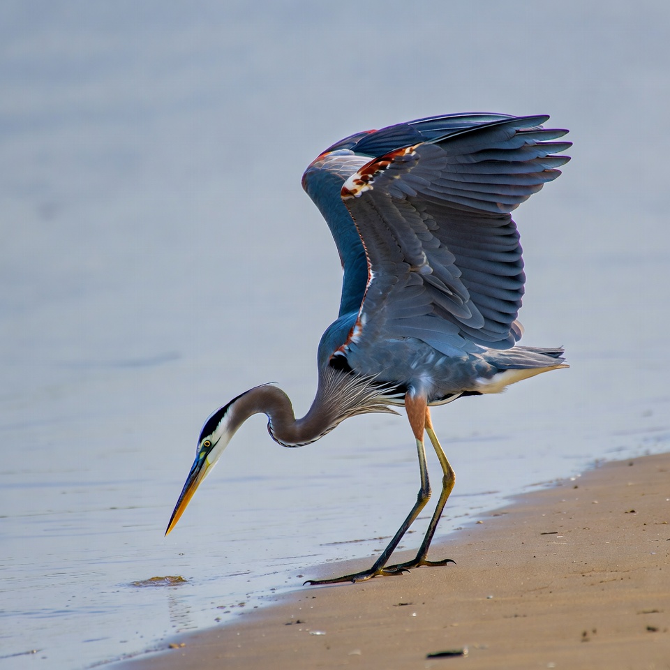 Great Blue Heron spreading wings on beach