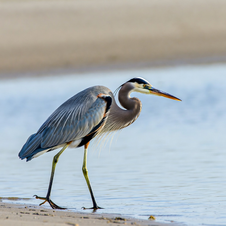 A great blue heron stands gracefully with wings slightly spread on a sandy beach near shallow water. Its gray-blue feathers, white head with black stripe, and bright orange beak are prominent. Long yellow legs support the bird as it wades at the shoreline.