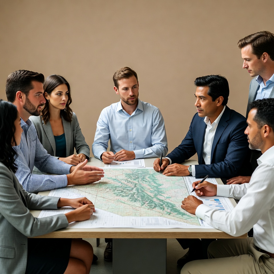 A diverse group of professionals including men and women sits around a conference table examining a large topographic map. They wear business attire such as suits, shirts, and blazers, with some holding pens and pointing at the map. The setting features a neutral beige background and a wooden table.