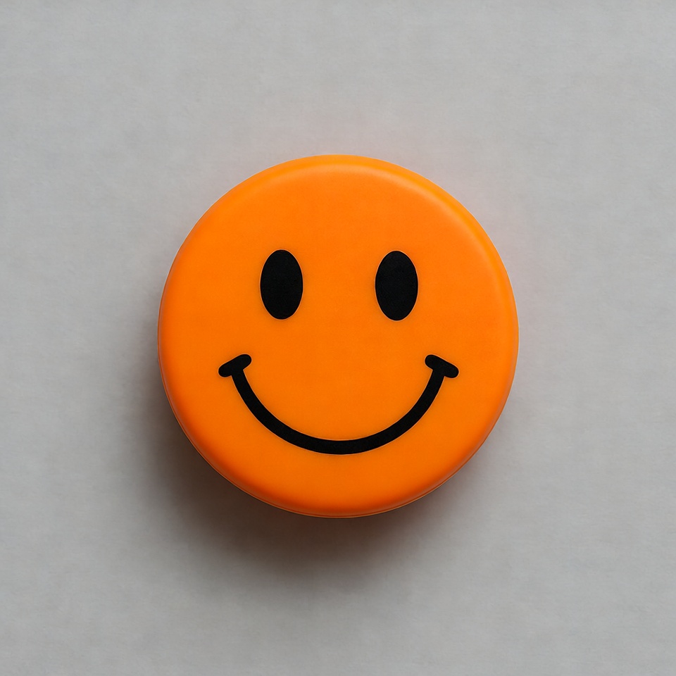 A bright orange circular smiley face with black eyes and a wide curved mouth sits on a plain white background. The emoji-like design features a simple, cheerful expression made from solid colors. It appears as a 3D rubber or plastic object viewed from above.