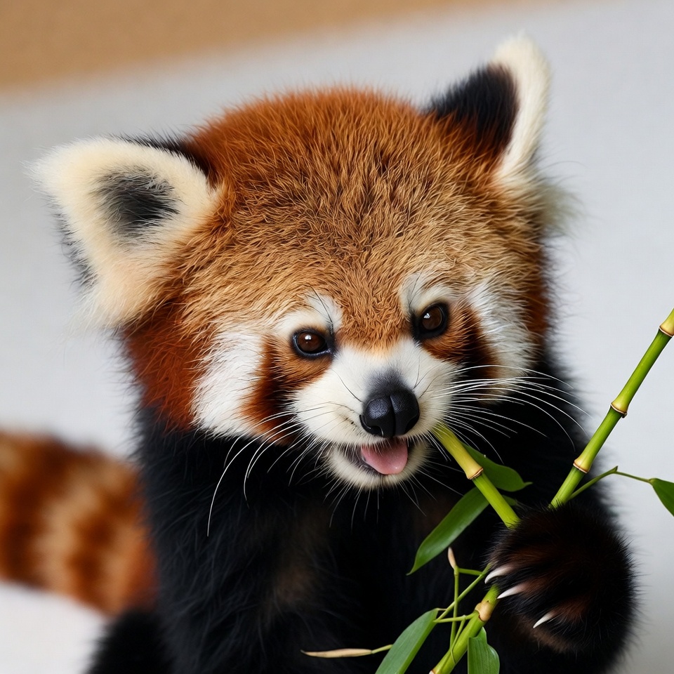 A cute red panda with reddish fur and white facial markings is munching on fresh green bamboo. It has large expressive eyes, fluffy ears, and black limbs, sitting against a plain light background. The panda holds the bamboo stalk with its paws while biting into the leaves.