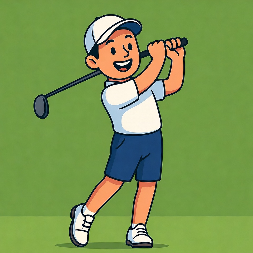 A cartoon boy with a big smile swings a golf club in a dynamic pose. He wears a white cap, white short-sleeve shirt, blue shorts, and white golf shoes. The illustration features a simple green background.