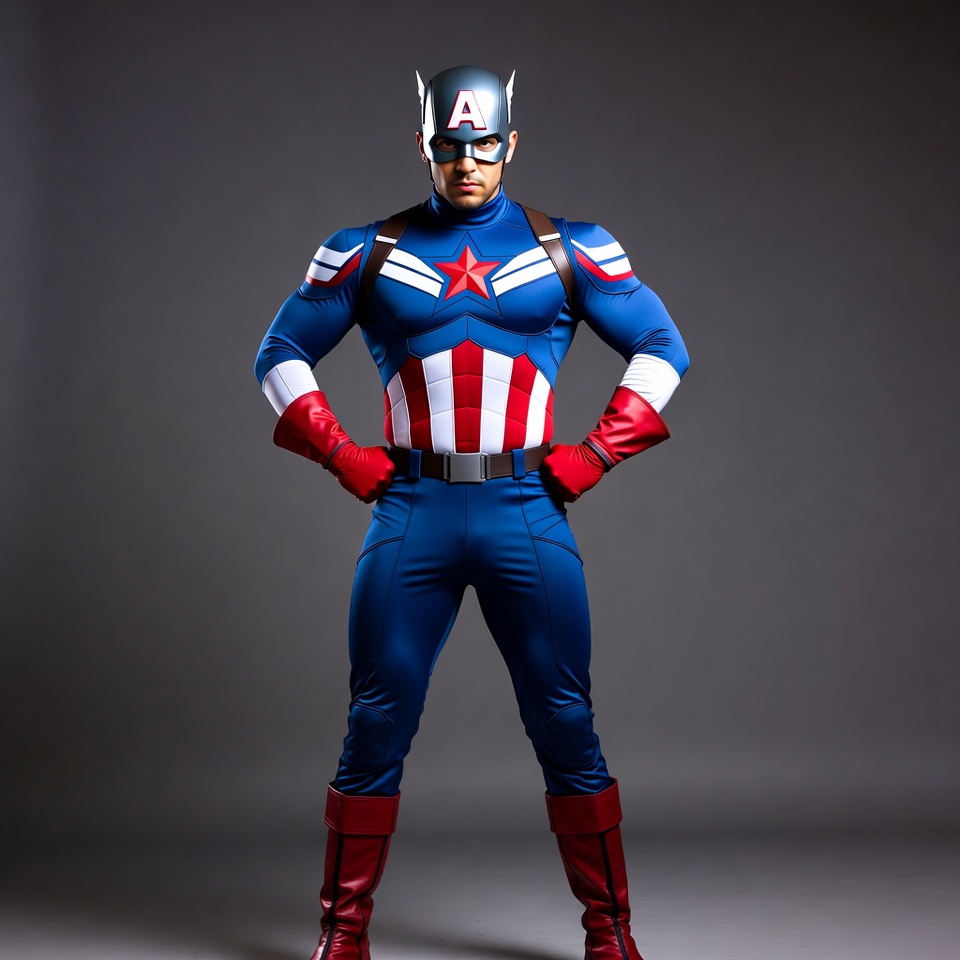 A muscular man stands confidently wearing a full Captain America superhero costume. He has the iconic blue suit with red and white stripes, a large white star on the chest, and red boots. He wears a silver helmet with an A emblem and poses with hands on hips against a gray background.