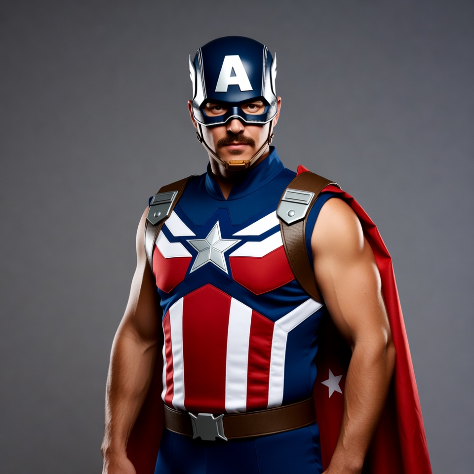 A muscular man with a mustache wears a detailed Captain America superhero costume including a blue helmet with white A, red and white striped suit with blue accents, brown straps, and a red cape. He stands confidently with arms at sides against a plain gray background. The costume features silver stars and protective elements on the shoulders.