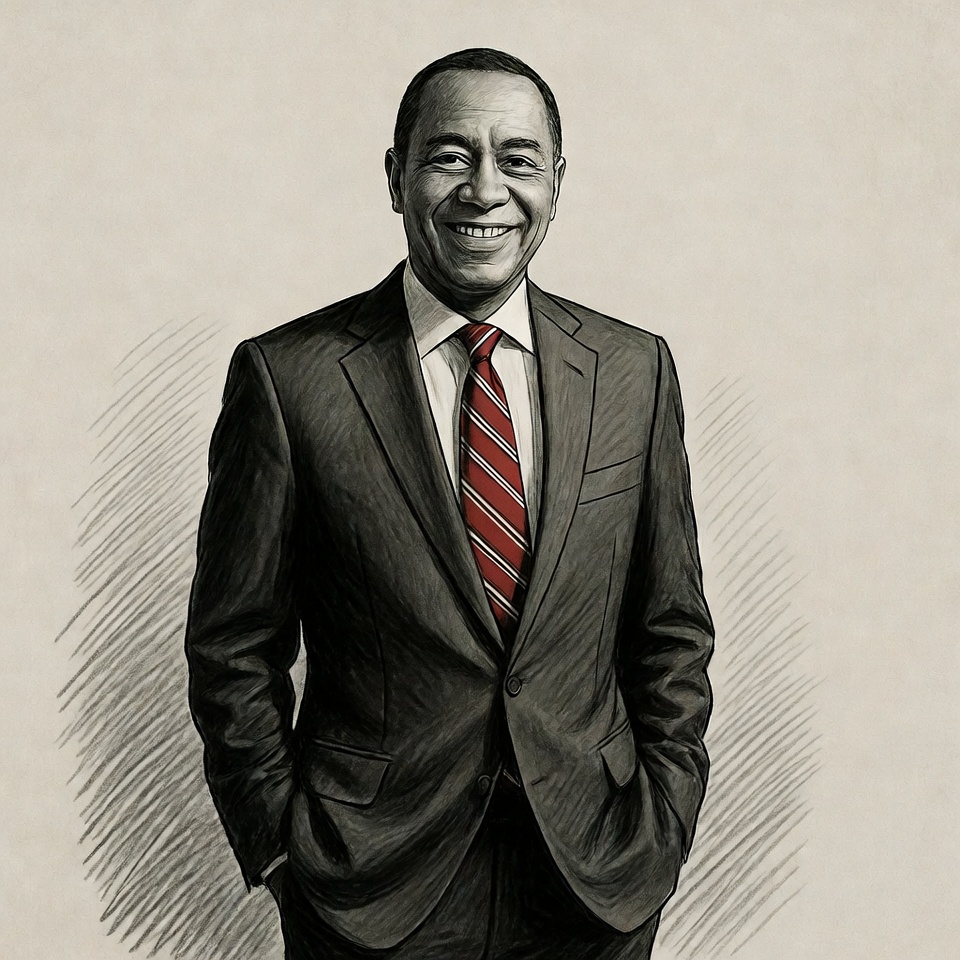 A detailed sketch illustration of an African-American man smiling confidently with hands in pockets. He wears a dark suit, white shirt, and red striped tie against a light beige background. The portrait style emphasizes his professional attire and warm expression.