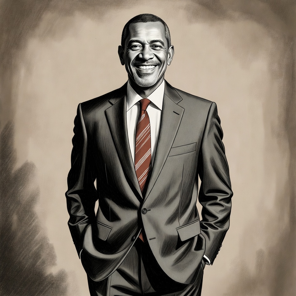 A detailed illustration of Barack Obama smiling confidently with hands in pockets. He wears a dark suit, white shirt, and red striped tie against a beige background. The artwork features a sketch-like style with shading.