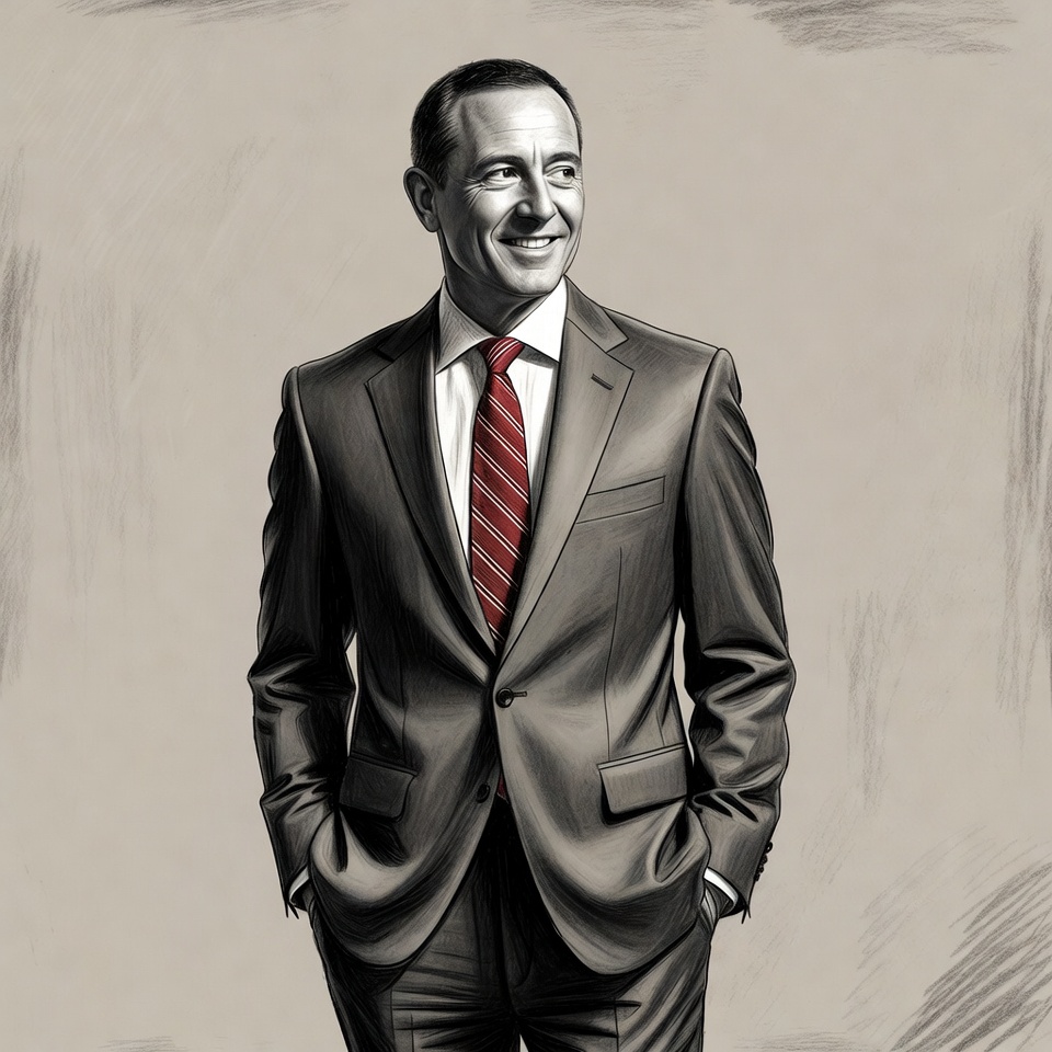 A middle-aged man with short dark hair smiles confidently while standing with hands in pockets. He wears a dark suit, white shirt, and red striped tie. The image is a black and white illustration on a beige background.