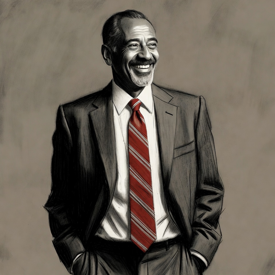 artistic rendering, businessman, confident, digital art, dress shirt, formal wear, grayscale, hands in pockets, happy expression, illustration, man, middle-aged, mustache, neutral background, portrait, professional attire, red tie, short hair, smiling, standing, suit, warm smile, African-American man