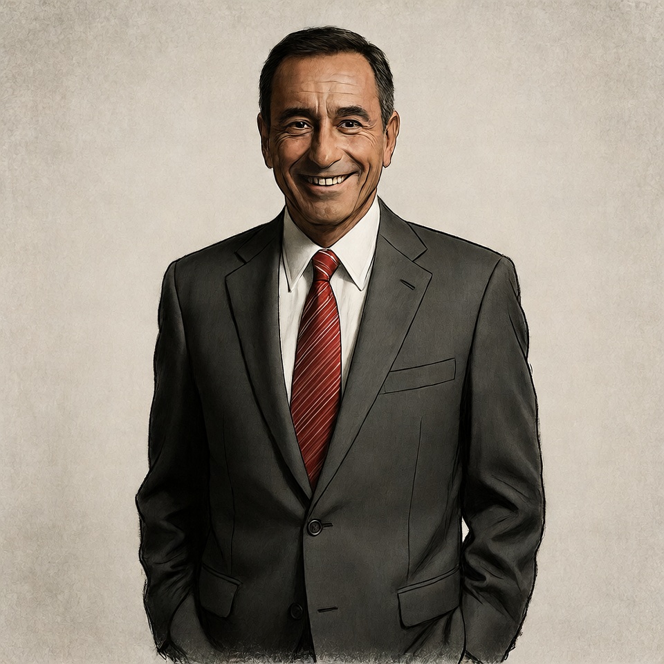 A middle-aged man with short dark hair smiles warmly at the viewer. He wears a dark gray suit, white dress shirt, and red striped tie, with hands in pockets. The portrait is rendered in a textured, illustrative style against a beige background.