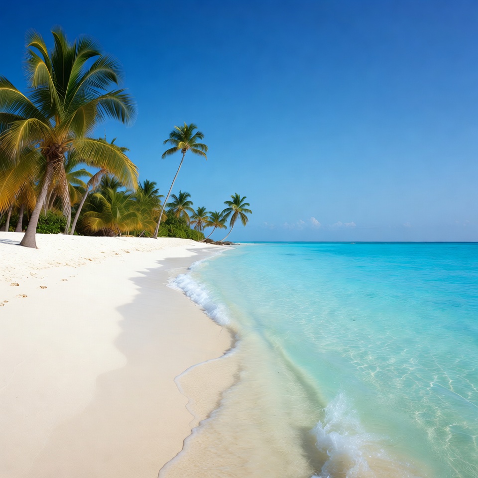 A pristine white sand beach meets clear turquoise ocean water under a bright blue sky. Tall palm trees line the shore, casting shadows on the sand. Gentle waves lap at the coastline with no people visible.