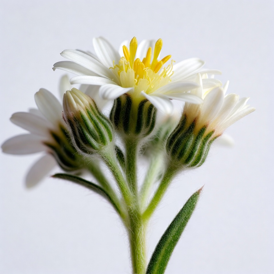 A cluster of small white daisies with yellow centers and green buds grows on thin stems. The flowers are arranged closely together against a plain white background. Fine details of petals, stamens, and fuzzy stems are visible.