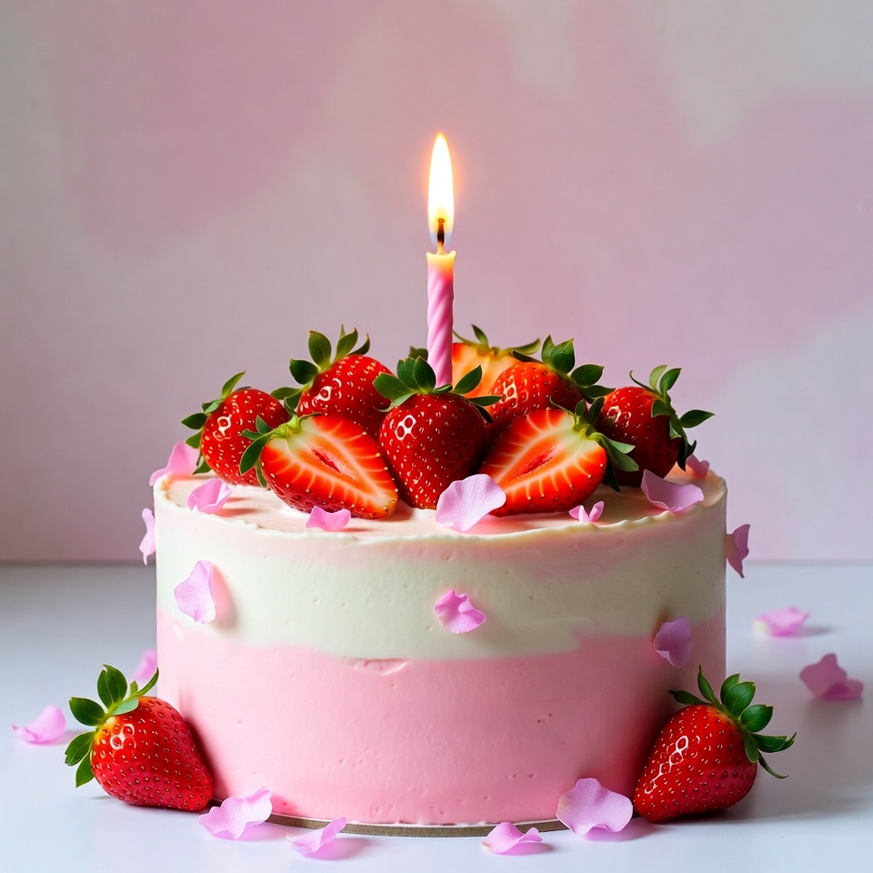 A pink and white layered cake is topped with fresh strawberries and pink petals. A single lit pink candle stands in the center among sliced strawberries. The cake sits on a white surface against a soft pink background.
