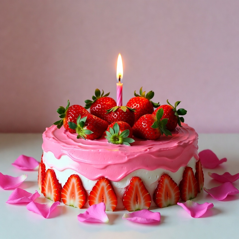 birthday cake, cake candle, cake decoration, cake topper, celebration cake, dessert, food photography, fresh strawberries, layered cake, lit candle, pink background, pink cake, pink frosting, pink petals, rose petals, single candle, strawberry topping, white frosting, white surface, strawberry cake