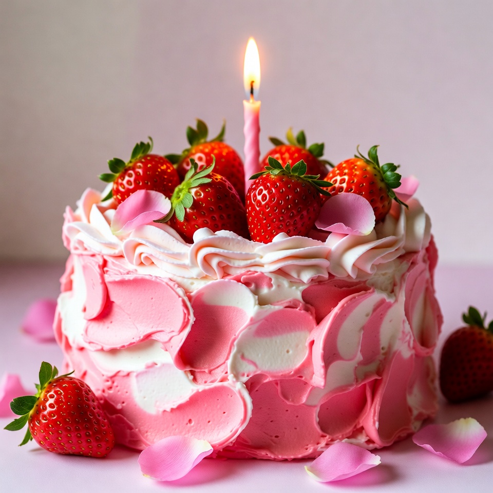 A round pink cake topped with fresh strawberries and a single lit pink candle sits on a pink surface. White and pink frosting swirls cover the cake, garnished with pink rose petals and additional strawberries. The cake is centered against a matching pink background.
