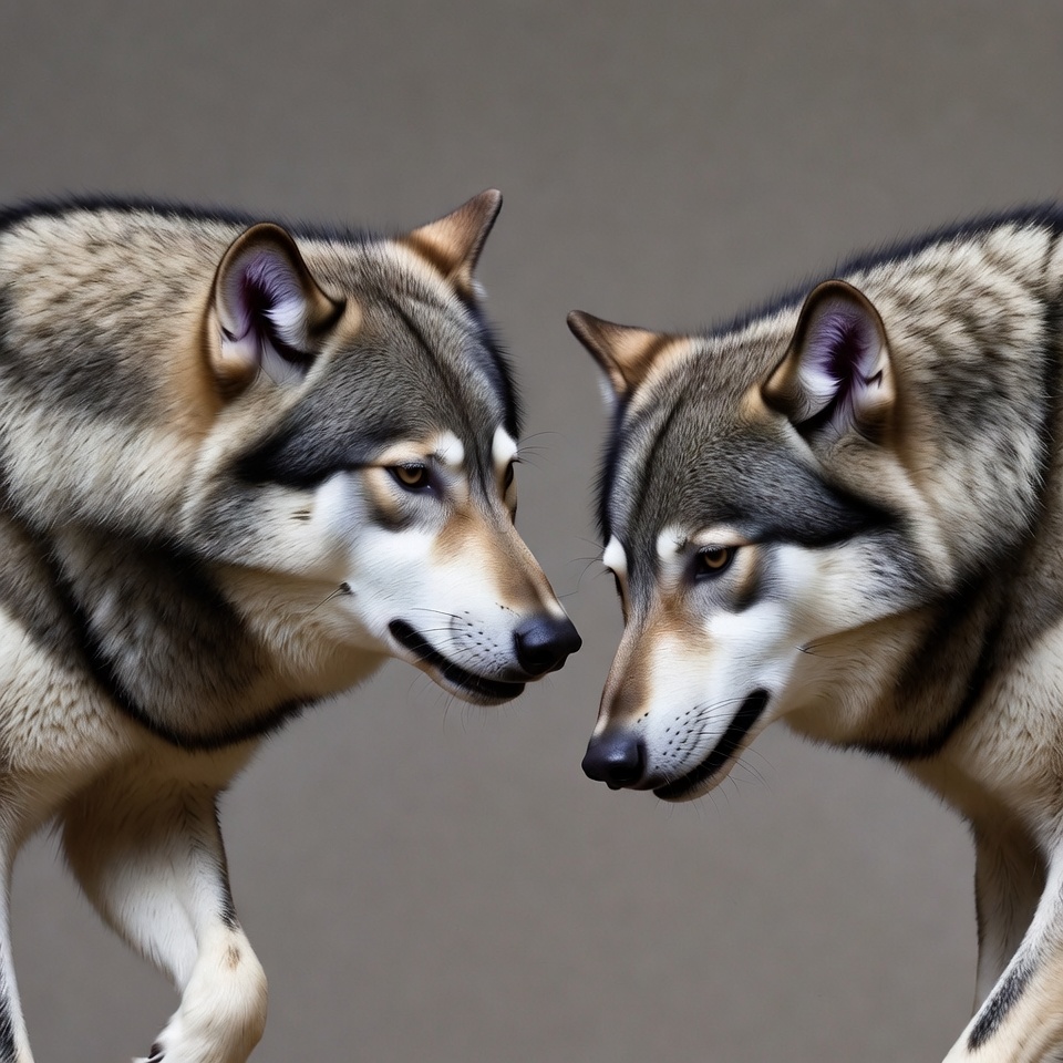 Two gray wolves with thick fur stand close together on a plain gray background. They face each other intently with their noses almost touching and ears perked up. Their coats feature shades of gray, brown, and white.