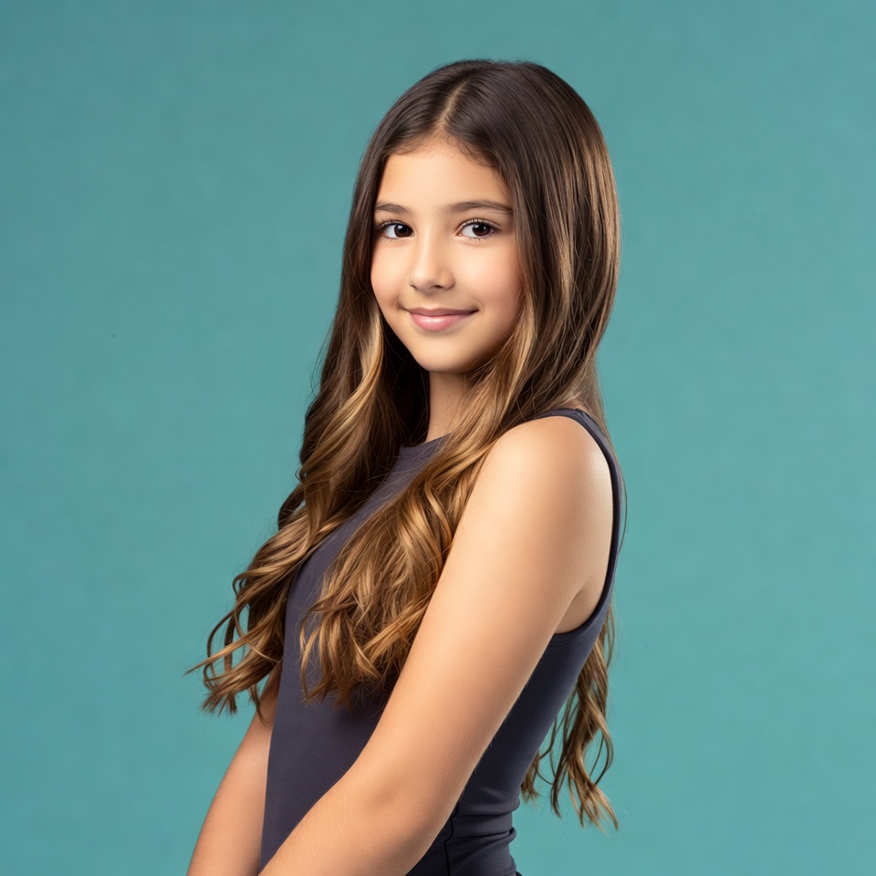 A young girl with long wavy brown hair smiles at the camera against a solid blue background. She wears a sleeveless dark top and stands with her arms crossed in front. Her expression is cheerful with bright eyes.