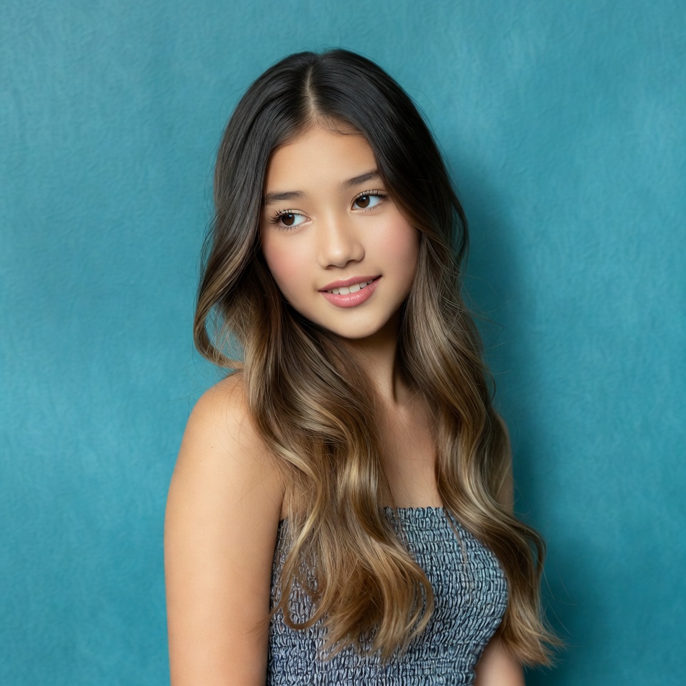 A young Asian girl with long wavy brown hair smiles gently while looking to the side. She wears a sleeveless tube top and stands against a solid blue background. Her expression is soft and her hair cascades over her shoulders.