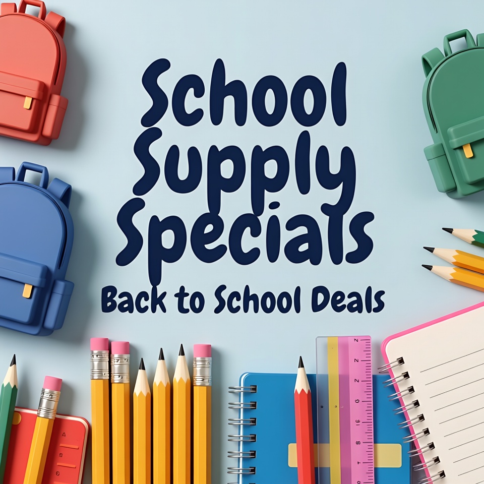 Colorful backpacks in red, green, blue, and orange surround the text 'School Supply Specials' and 'Back to School Deals' on a light blue background. Various school supplies including pencils, notebooks, and rulers are arranged around the edges. The items are rendered in a vibrant, illustrative 3D style.