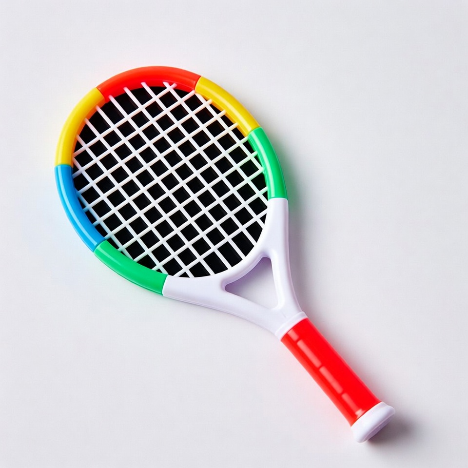 black strings, colorful racket, isolated background, kids racket, plastic racket, rainbow tennis, red grip, red yellow green blue, sports equipment, tennis gear, toy racket, vibrant colors, white frame, tennis racket