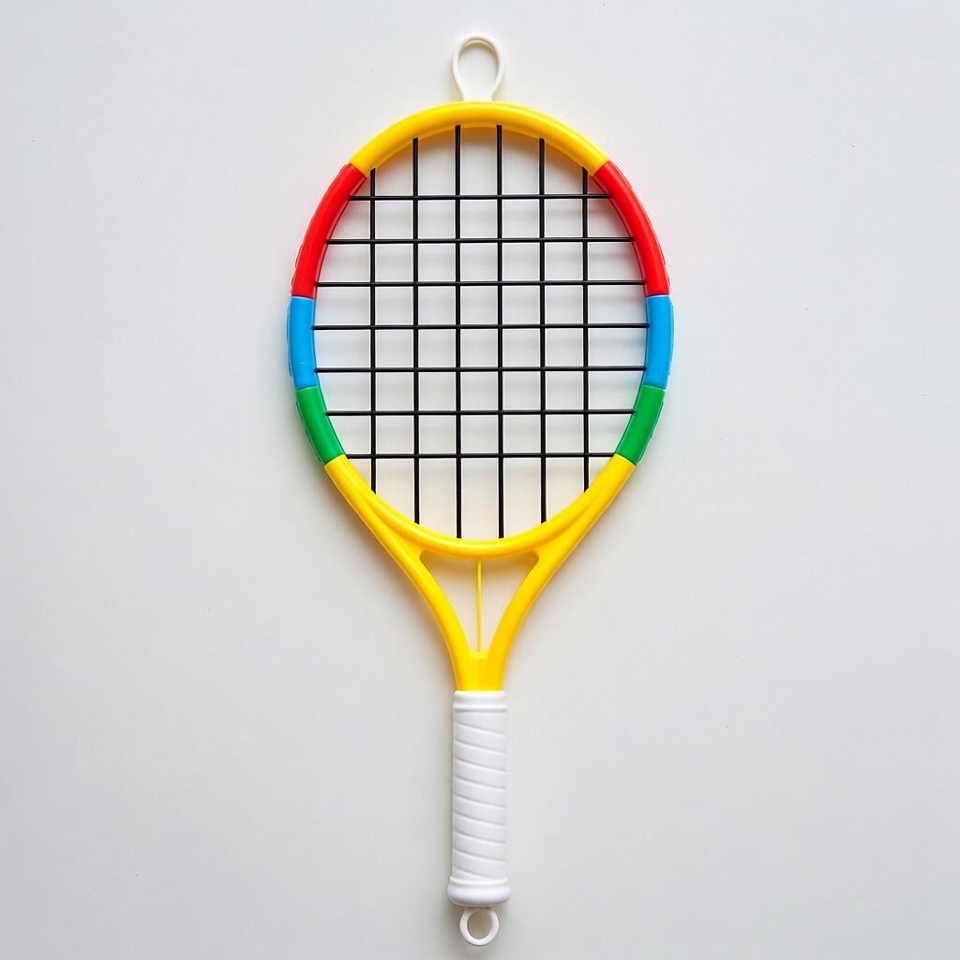 blue rim, childrens tennis, colorful racket, green rim, hanging loop, isolated background, kids racket, play racket, red rim, small racket, sports equipment, tennis gear, toy racket, white handle, yellow racket, tennis racket