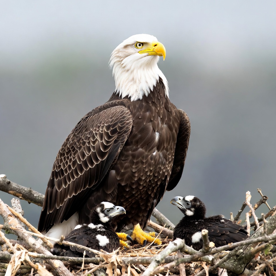 A majestic bald eagle with white head and yellow beak stands in a nest made of twigs. Three fluffy eaglet chicks huddle around the adult eagle. The background is a misty natural setting.