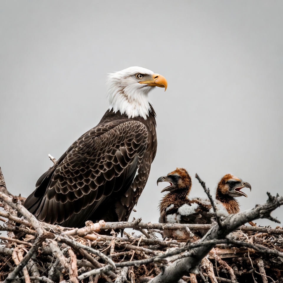 A majestic bald eagle with white head and yellow beak stands in a nest made of twigs. Two fluffy brown eaglets with open beaks huddle beside the adult eagle. The scene is set against a soft gray background.