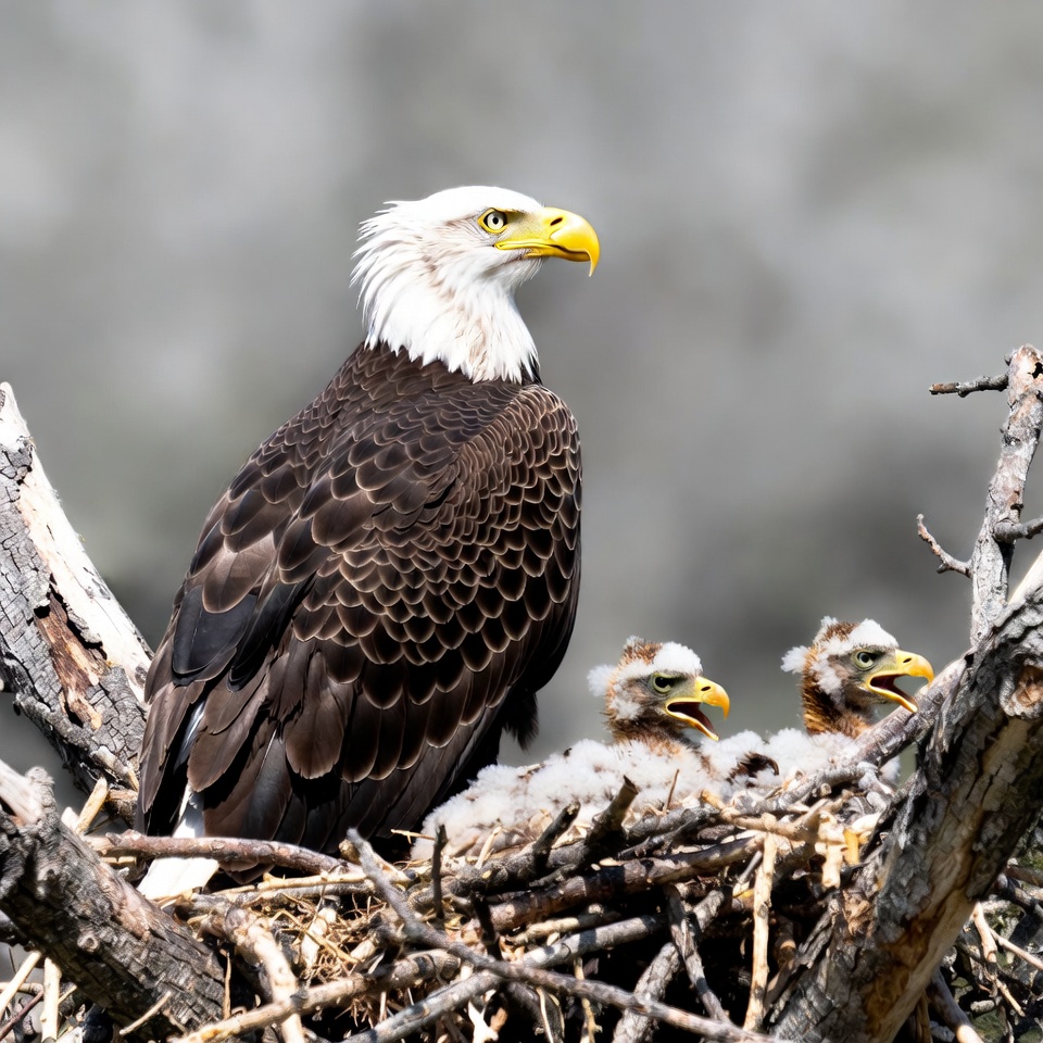 A majestic bald eagle with white head and yellow beak perches in a nest made of twigs. Two fluffy eaglets with downy feathers huddle beside the adult eagle. The background is misty and gray with branches visible.