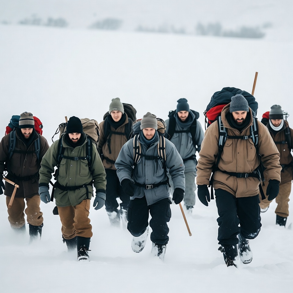 A group of men in winter jackets, backpacks, and beanies trek through deep snow in a foggy field. They carry walking sticks and wear sturdy boots, with some sporting beards. The background features distant snowy bushes under overcast skies.